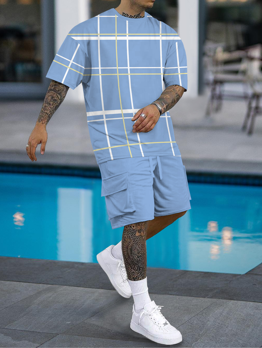 Men's fashion casual color matching printed short sleeve pocket shorts two-piece set