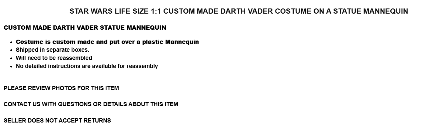 STAR WARS LIFE SIZE 1:1 CUSTOM MADE DARTH VADER COSTUME - STATUE MANNEQUIN(After placing the order, customer service will contact you)