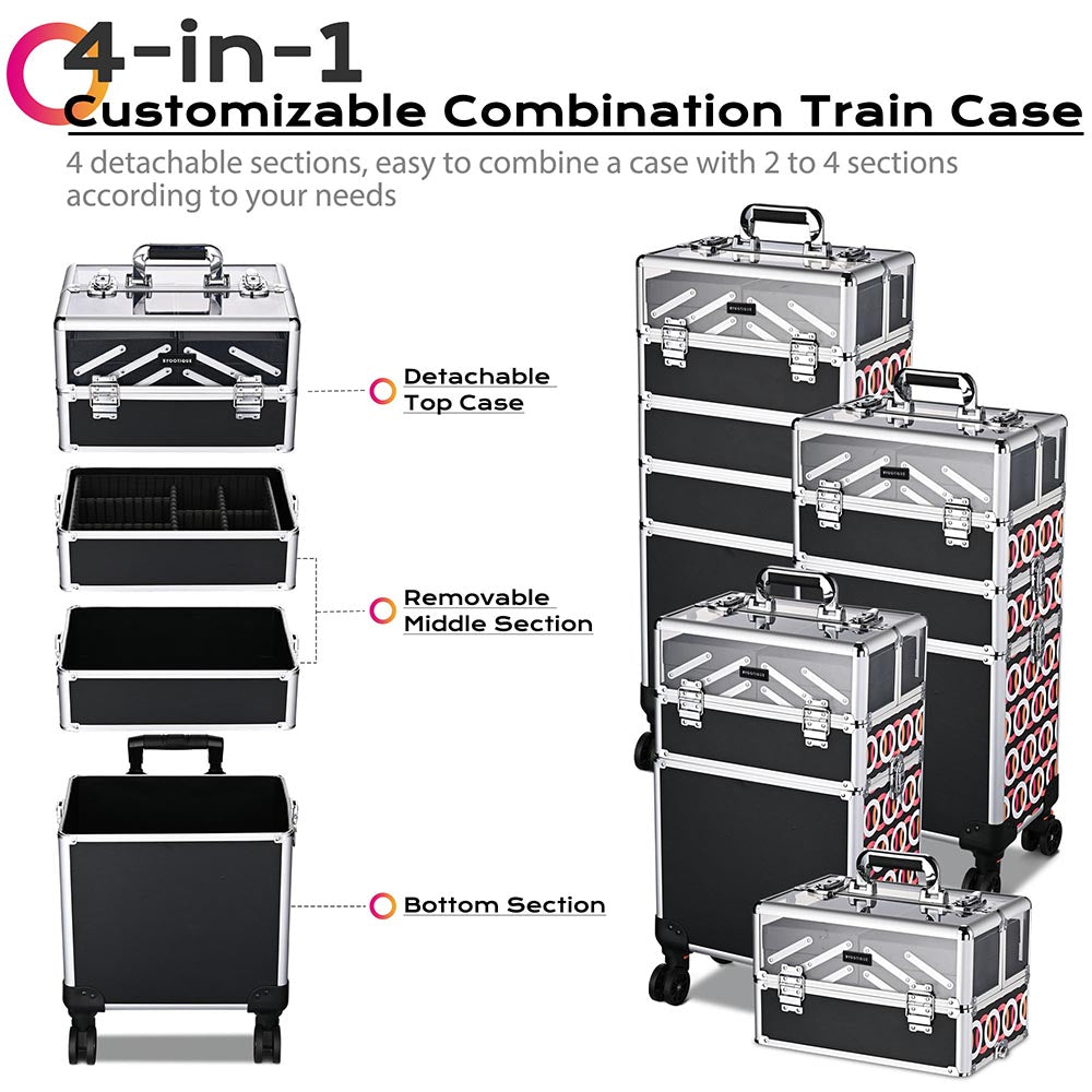 - 4in1 Customizable Structure - 4 Detachable sections for easy combination according to the needs of makeup artists; top section with 4 extendable trays, can be used as a small train case alone; 2nd and 3rd section feature medium size compartment and a removable tray; large bottom section provides enough space for keeping hair dryer, curling iron, etc.