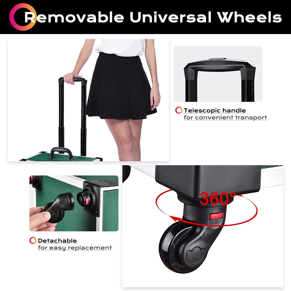 - Removable Universal Wheels - 4 pcs universal wheels for smooth movement & labor saving, also detachable for easy replacement when broken; Telescopic handle facilitates easy business trips or door-to-door makeup service
