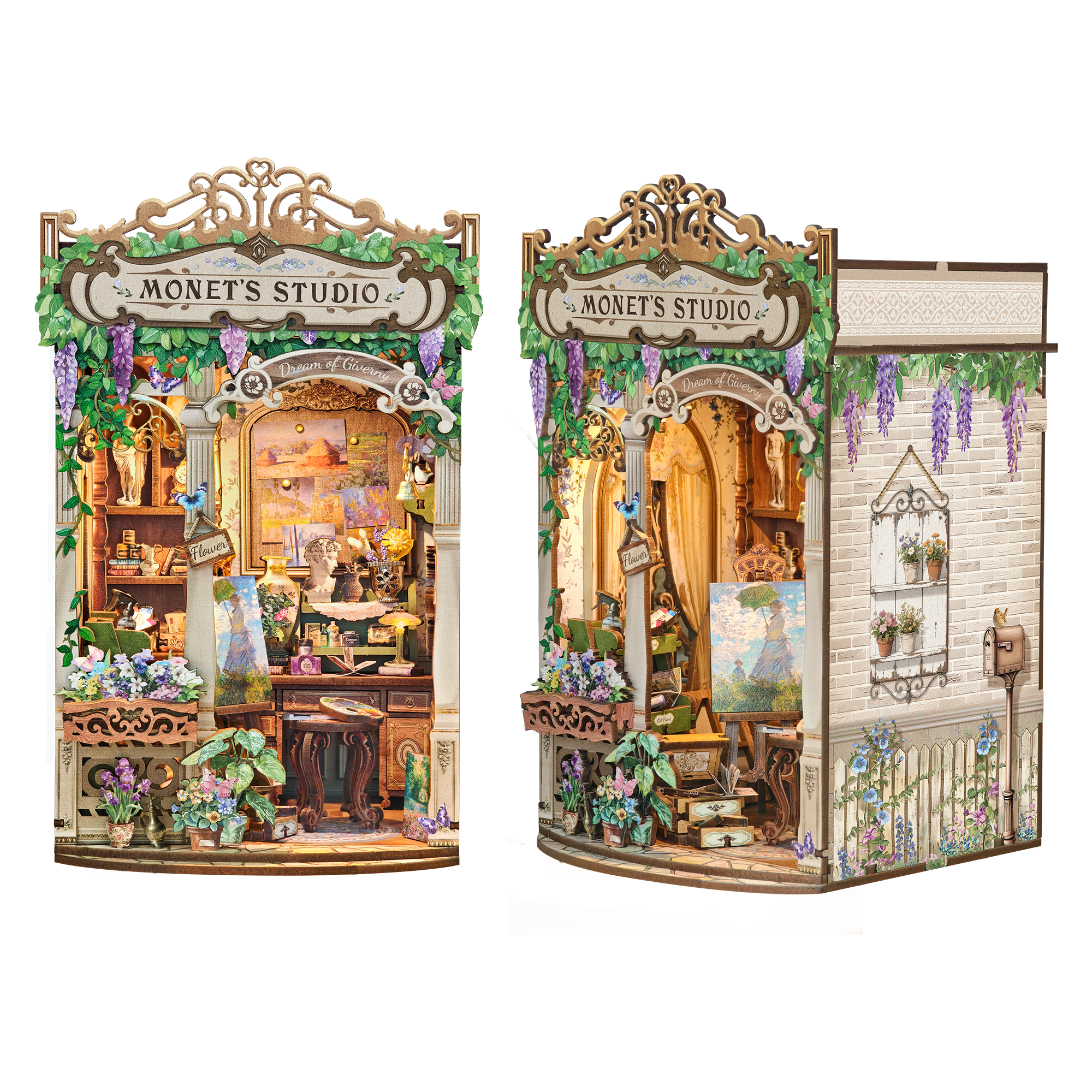 The Monet's Impression DIY miniature kit recreates a calm, light-filled art studio inspired by Impressionist painting. A paint-splashed workbench, neatly arranged brushes, canvas storage and softly lit shelves come together to feel like the corner where an artist has just stepped away for a moment.