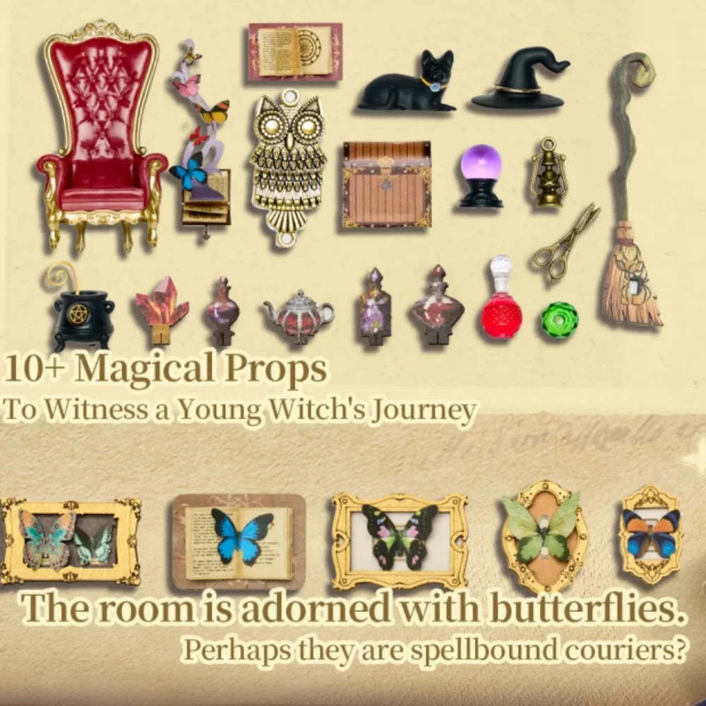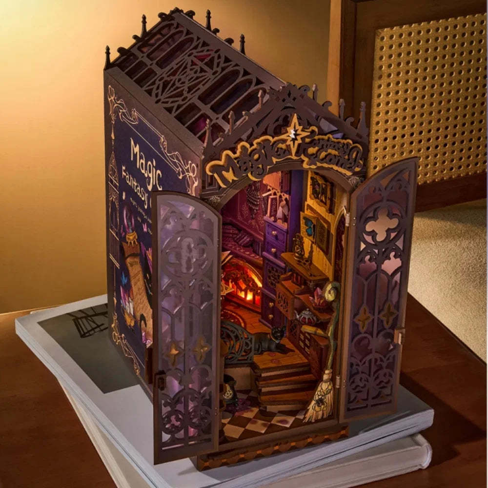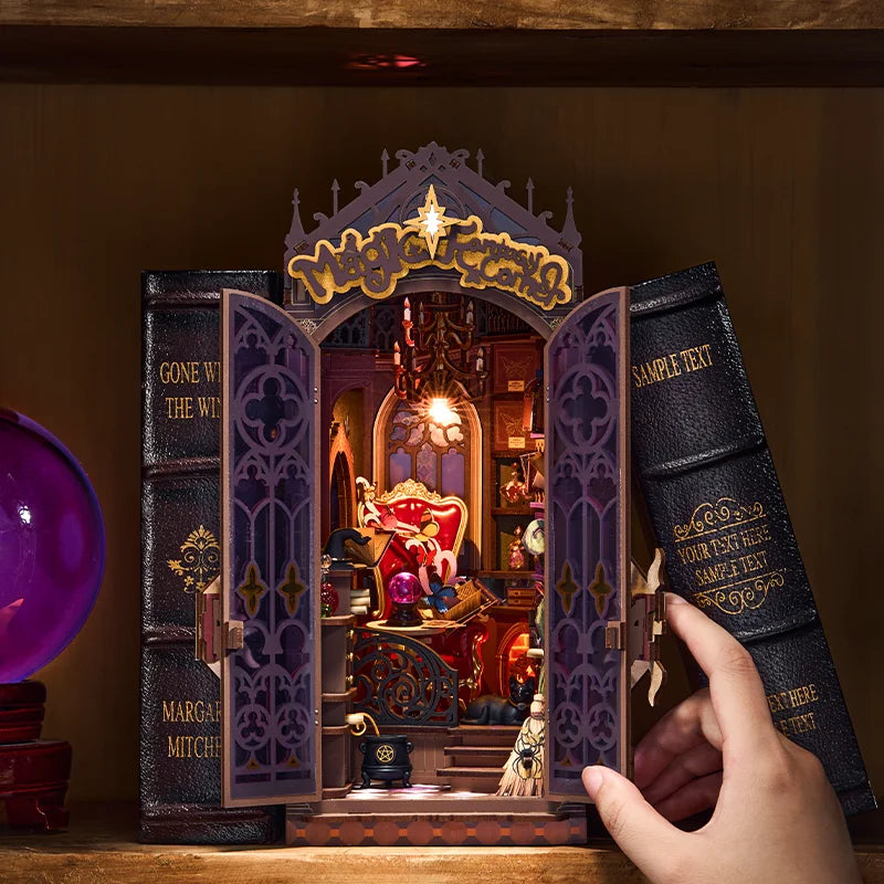 Open the door and let the library glow to life—this spellbound nook invites spirit butterflies, climbing vines, and tarot whispers to dance in warm light. The double-door design offers playful interaction: open to light up, close to dim for a truly immersive, magical scene. No glue needed—pre-cut parts + included double-sided tape make assembly neat and friendly. A whimsical display for book lovers and fantasy makers.
